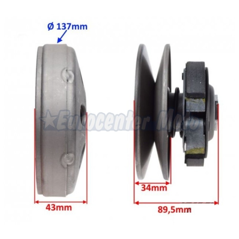 Incluye campana de embrague, embrague y poleas premontadas, garantizando un funcionamiento equilibrado y una transmisión suave de la potencia. La campana cuenta con un diámetro exterior de 132 mm (155 mm en la zona de polea) y un diámetro interior de 125 mm. El conjunto presenta un ancho total aproximado de 89,5 mm, con 34 mm en la zona de polea y 43 mm en la campana.